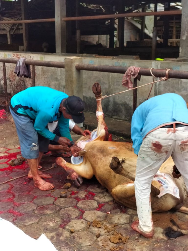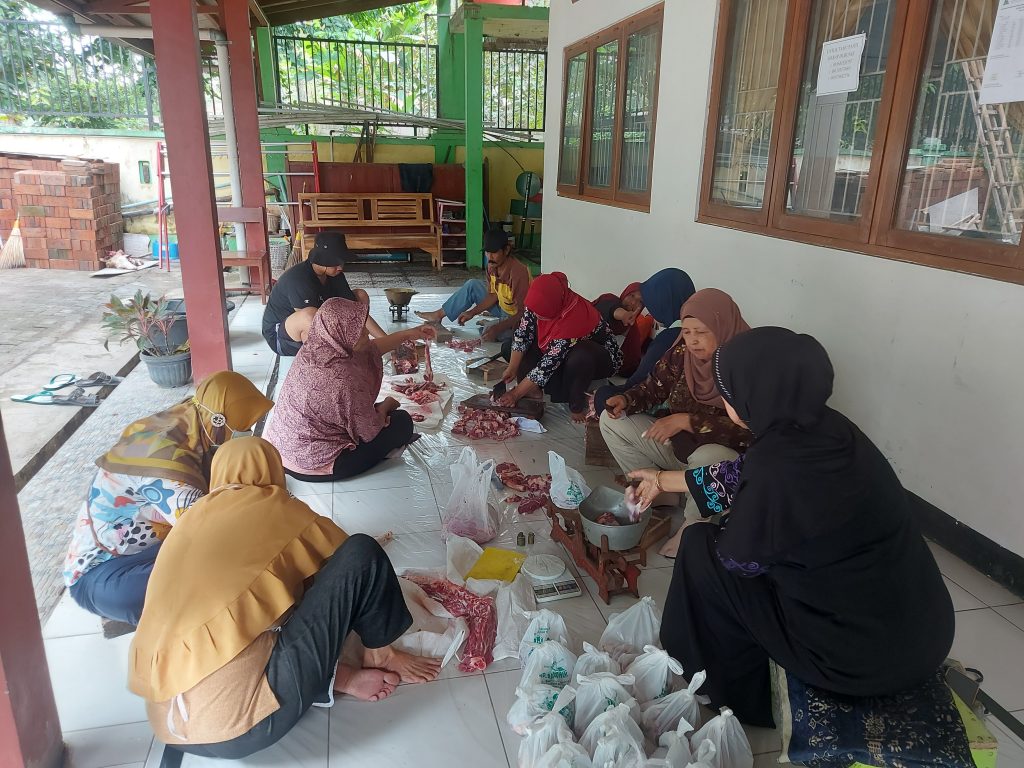 di Panti Asuhan sapi dan kambing yang telah disembelih di potong-potong di bantu oleh penguruus dan panitia dari lingkungan panti asuhan sebelum di serahkan kepada anak-anak Panti Asuhan, kaum Dhuafa dan lingkungan sekitar.
