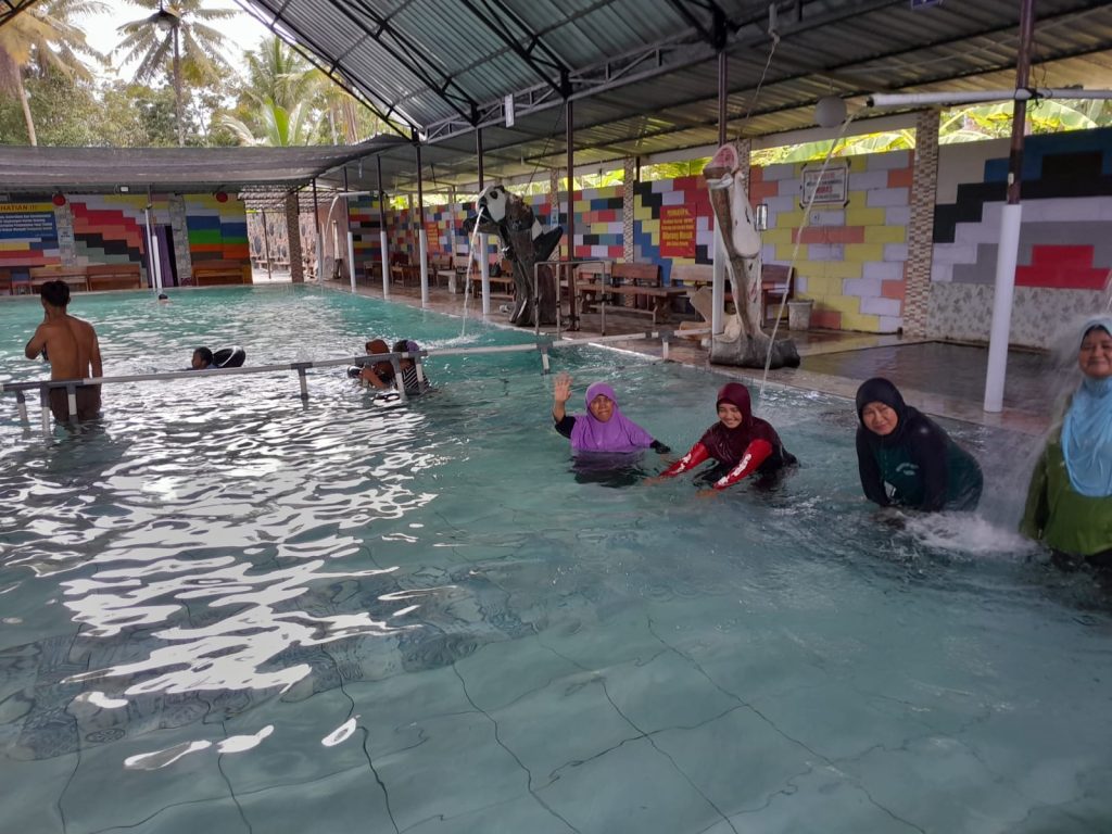 anak-anak dan pengurus bersiap untuk berenang di kolam air hangat, anak-anak merasa senang setelah lelah dalam menjalani berbagai kegiatan dan ujian akhir semester dan puas dengan hasil belajar satu semester dengan berenang di kolam hangat bersama-sama.